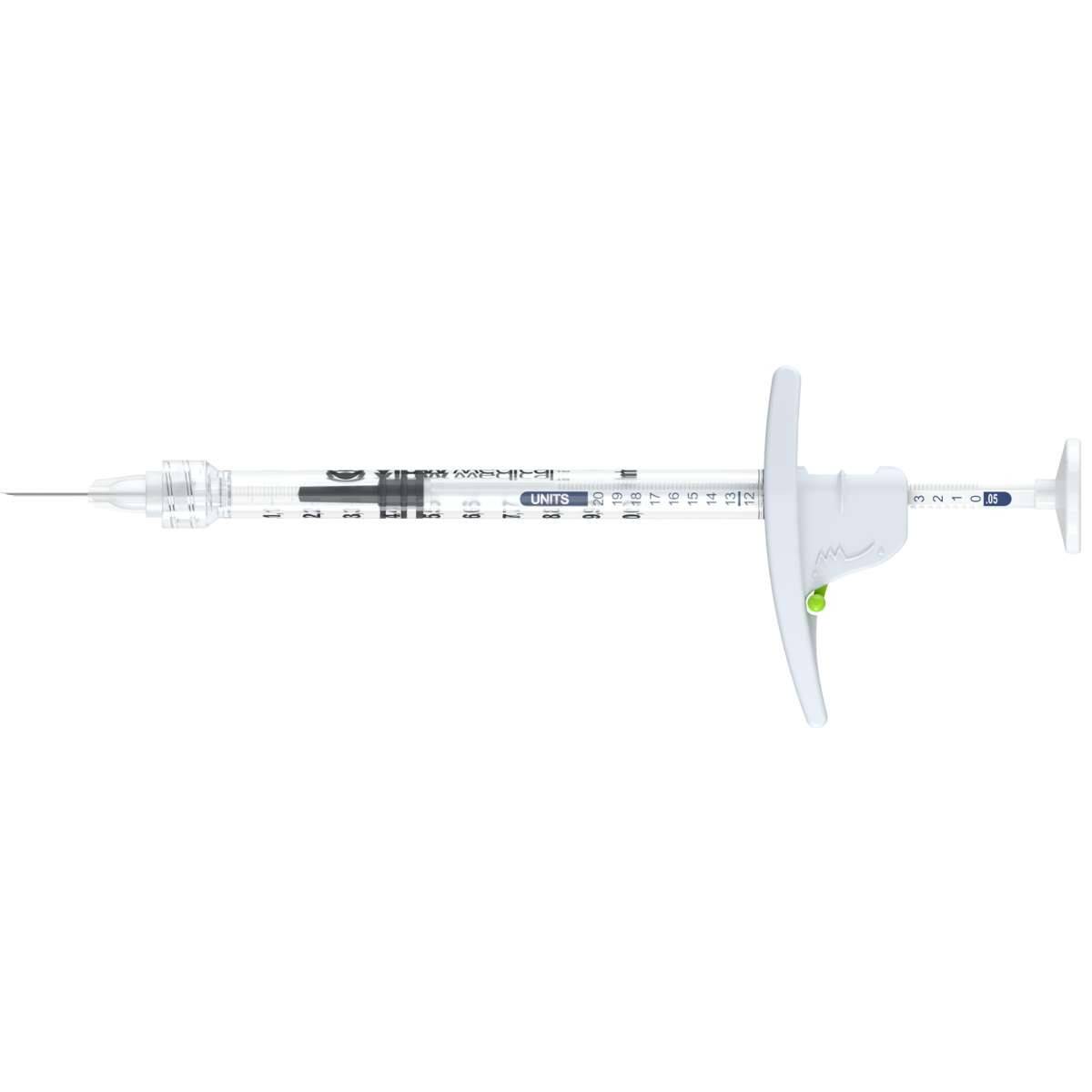 The green syringe features the dose-unit setting options 0.0125ml, 0.025ml and 0.05ml for the dilution amounts 0.63ml and 1.25ml.
